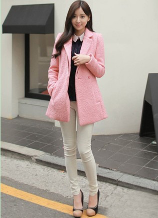 这样一身冬装搭配可是很知性端庄的,糖果粉色的西装款式大衣外套混搭上白色衬衫和蓝色的毛衣,保暖偶很有层次感,下半身搭配上白色的紧身裤和高跟鞋,上班的MM们可以尝试的冬装搭配哦!