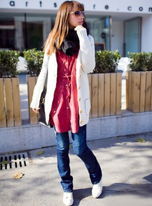白色毛衣外套,内搭红色中长款衬衫,经典的牛仔裤黑色白色球鞋,是不是有点小清新的风格呢?黑色的围脖与黑色单肩包相衬,也遵循全身上下三种色彩的审美原则,非常好看。