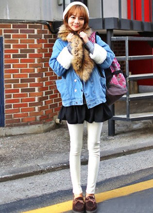 今年冬季很多MM们都很喜欢的牛仔外套款式的棉服,羊羔毛的内衬绝对的保暖了,大大的皮草衣领时髦又很有个性了,里面混搭上灰色的卫衣就很温暖了,黑色的短裙搭配上白色的打底裤和单鞋,一样让MM们穿出高挑九头身出来了!