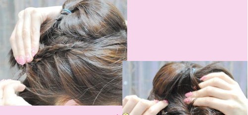 第三步:接下来开始编蜈蚣辫,注意了这里是两股的,在下方要挑一缕头发跟着一起辫。 第四步:绕着下面编一圈蜈蚣辫,编完以后,在头上绕一圈,用夹子夹住,固定。