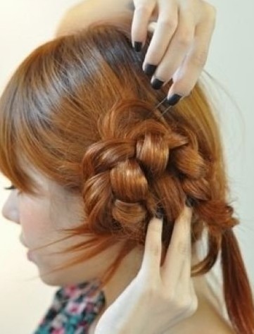 蓬松而具有体积感的麻花辫在耳朵边绕成一个发髻状形状,用发夹固定住。