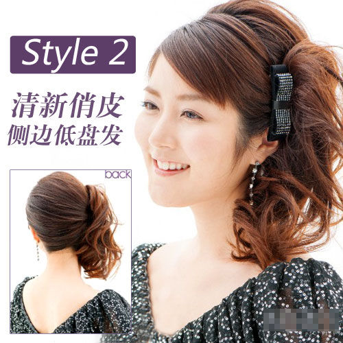 整齐的盘头与散落的卷发组合,看上去既清新俏皮又不显死板。容易看上去幼稚的侧边发束经过看似不经意的打造也能带出成熟感,向侧倾斜的发束让人看到你时尚而又性感的一面。在打造这款发型时,发束的位置是关键,在头部中下方固定的发束看上去会比较优雅,而散散的卷发更是能让女人味升级的好方法。