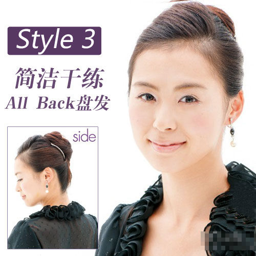 此款All back盘发简洁干练,突出了发型的层次感。头顶上扬的头发线条,对脸型也有提拉的作用。建议发髻盘得高些,否则容易显得脸部线条下垂。