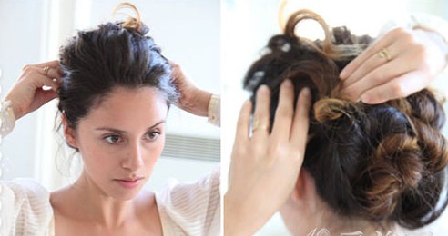 Step 7&8 将头顶部分的头发放下,同样用卷发棒进行卷烫。 造型步骤: Step 9 卷烫后的头发用手往后梳散。 Step 10 将前面的头发分成若干发束,松散地固定在后面发髻处。 造型步骤: Step 11&12 继续进行细致的整理,保持发髻的造型同时保持前面头发的松散感即可。