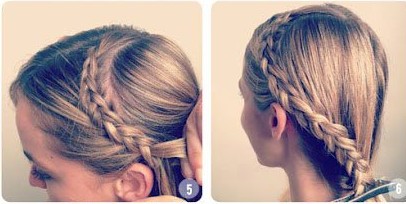 Step5.把头发编到耳后,然后你可以开始在编发的过程中将自己的头发一点点加进去。